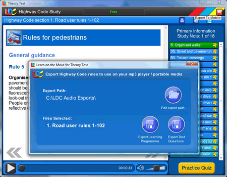 • Learn on the Move to allow you to download questions and answers as MP3 files or Podcasts or sync direct with LDCs Free Android and iOS Theory Test Apps.The only product to allow you to undertake Theory Tests either on your PC or your mobile App and synchronise your results.